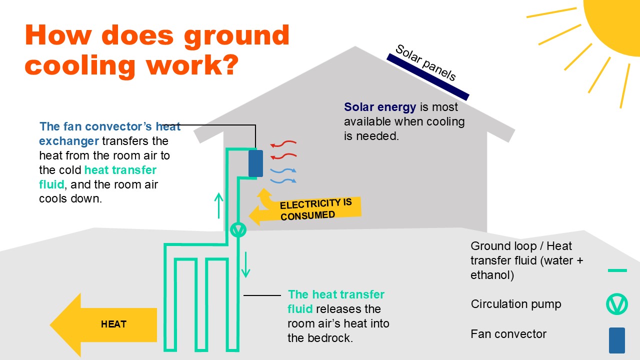 Geothermal heating systems are based on solar energy stored in the ground. Geothermal cooling is done largely with the same equipment as geothermal heating. Therefore, it is a good idea for housing companies to also consider the cooling option when making a decision on geothermal heating. The cooling system requires electricity to work, and to this end, solar panels can be installed on the roof of the building. In addition to the benefits of conventional property cooling, installing a geothermal cooling system also improves the performance of geothermal heating by transferring heat from the indoor air into the bedrock during the summer.